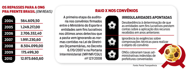 No caso do Programa Segundo Tempo, das entidades investigadas nos últimos sete meses, a que mais tem exigido “taxas administrativas” das prefeituras é a ONG Pra Frente Brasil, comandada pela vereadora do PCdoB em Jaguariúna (SP) Karina Rodrigues. Nos últimos sete anos, a entidade recebeu R$ 28 milhões do Ministério do Esporte, sendo R$ 12,9 milhões apenas no ano passado. Com trânsito livre nos corredores do ministério, a vereadora se apresenta como a responsável pela implantação do Segundo Tempo nas cidades do interior de São Paulo. Segundo os auditores do TCU, está comprovado que a Pra Frente Brasil há anos cobra dos prefeitos uma taxa de administração para que o município seja favorecido. O ministro Marcos Bemquerer, relator de alguns dos casos investigados, assegura que a prática é ilegal e esse dinheiro deverá ser objeto de investigação específica da Polícia Federal.