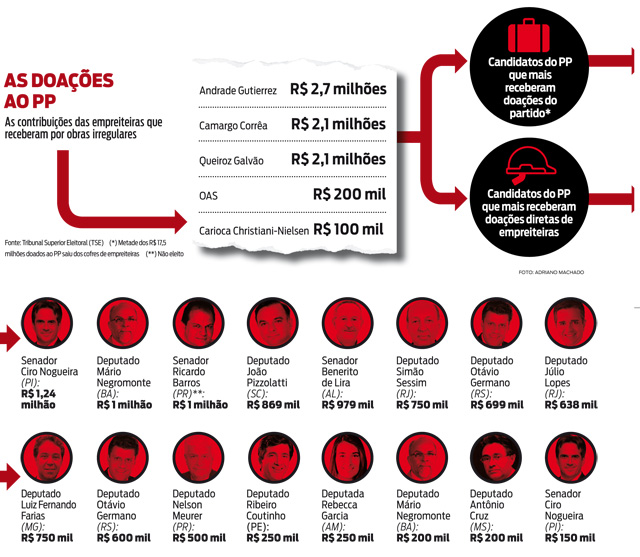 Com interesse direto nas obras do Ministério das Cidades, as empreiteiras contribuíram oficialmente com cerca de R$ 15 milhões nas campanhas do PP em 2010. A maior parte (R$ 8,7 milhões) na forma de doações ocultas. Isso significa que o dinheiro foi para a conta do partido, durante a campanha eleitoral, e imediatamente distribuído entre os seus candidatos. Três das grandes construtoras do País, Andrade Gutierrez, Camargo Corrêa e Queiroz Galvão repassaram legalmente um total de R$ 7,5 milhões para as campanhas do PP. Apenas três obras de mobilidade urbana tocadas por essas empresas com recursos do Ministério das Cidades somam R$ 2,7 bilhões. Só a implantação da Linha 3 do Metrô do Rio de Janeiro tem orçamento de R$ 1,3 bilhão. O Tribunal de Contas da União encontrou um superfaturamento de R$ 57 milhões no contrato, tocado pelas empresas Queiroz Galvão e Carioca Christiani-Nielsen. Após a ação do Tribunal, os preços que estavam acima dos valores do mercado foram refeitos. Em novembro do ano passado, porém, o TCU determinou a paralisação dessa obra por conta de falhas no seu projeto básico. A Secretaria de Transportes do Rio de Janeiro, que executa a obra, já apresentou o novo formato do projeto ao tribunal, que ainda não se manifestou. A obra de conclusão do Complexo Viário Baquirivu–Guarulhos, com orçamento de R$ 101 milhões, é outro exemplo de problemas. Tocada pela Construtora OAS, está na lista de irregularidades graves desde 2003. O TCU apontou superfaturamento de R$ 6,9 milhões. Mas a Prefeitura de Guarulhos informou que não tem interesse em executar o restante da construção. O Tribunal busca agora recuperar o dinheiro público desviado.