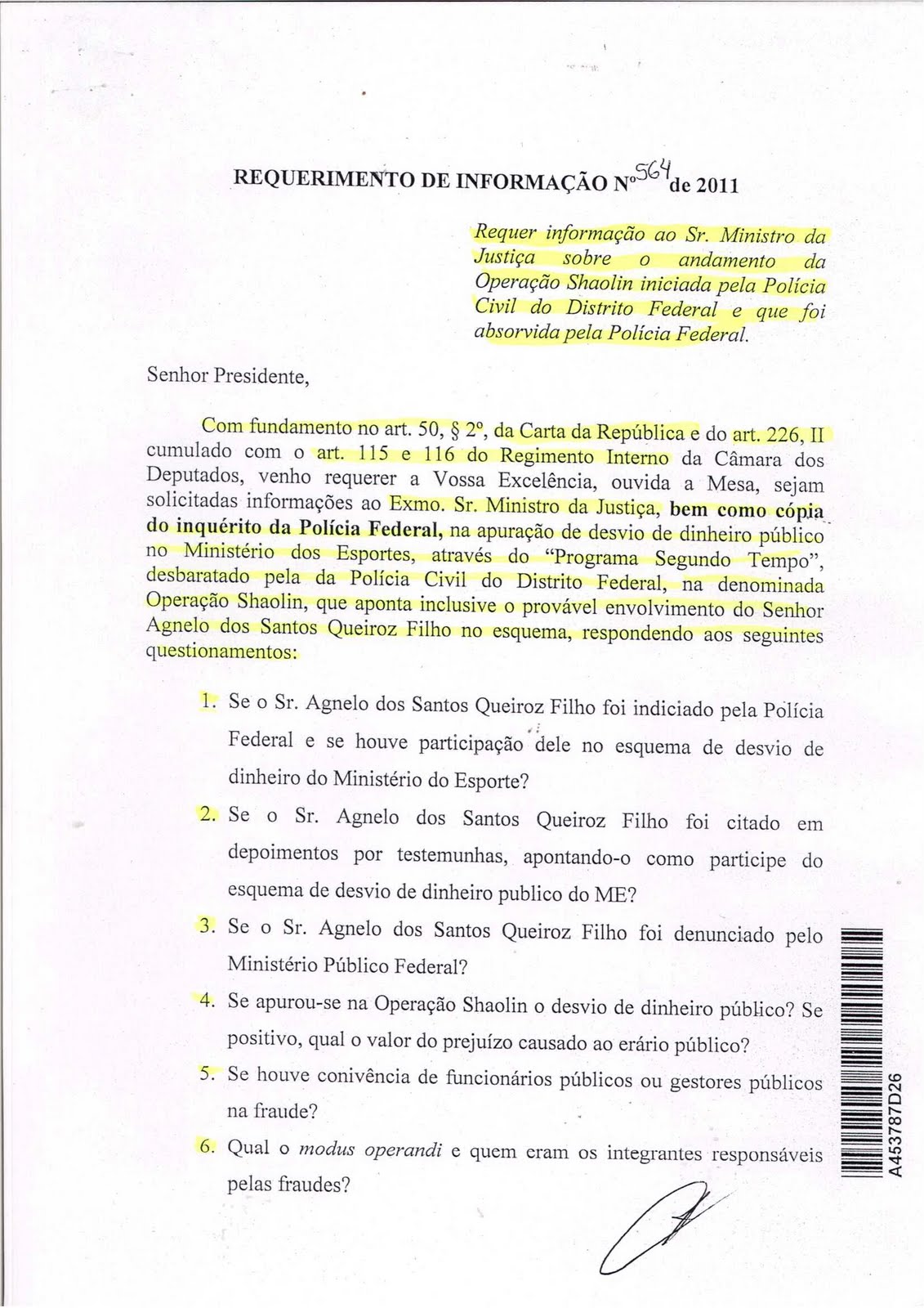 Olhe só este requerimento do deputado federal Izalci Lucas (PR). Contém seis perguntas feitas ao ministro da Justiça sobre Agnelo dos Santos Queiroz Filho, atual governador do DF.